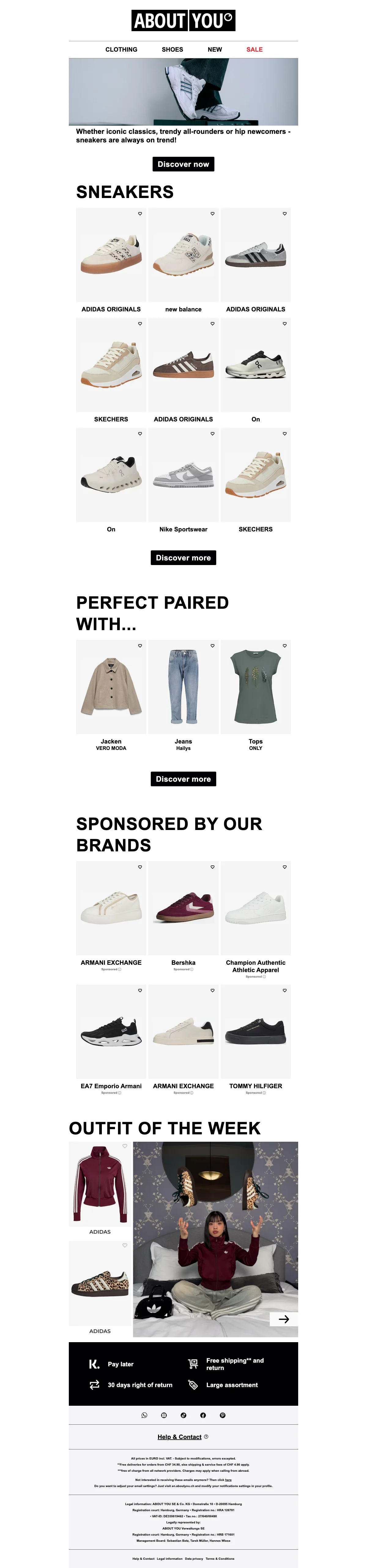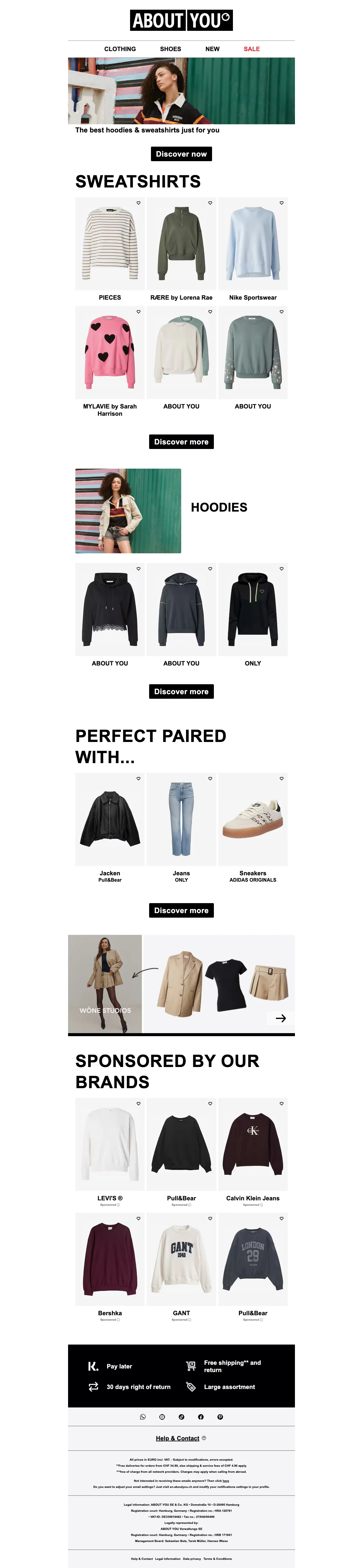 Chez About You vous êtes sûrs de trouver votre bonheur parmi la collection de prêt-à-porter, d'accessoires, de lingerie et de chaussures. Toutes vos marques favorites comme Adidas, Only, Levi's, Diesel, Calvin Klein sont au rendez-vous ! About You Suisse propose également des vêtements sous sa propre marque, de quoi satisfaire tous les styles même les plus pointus !