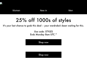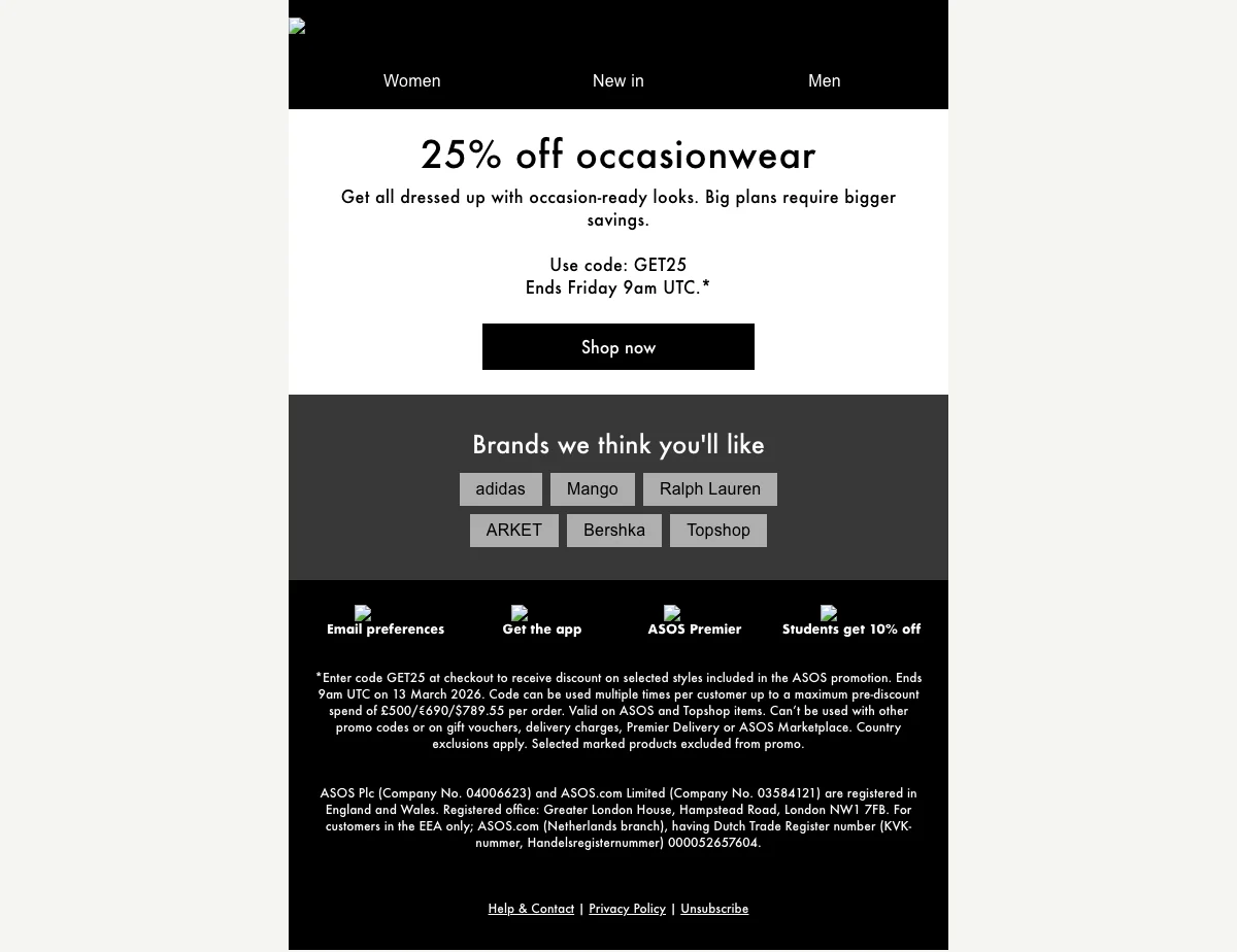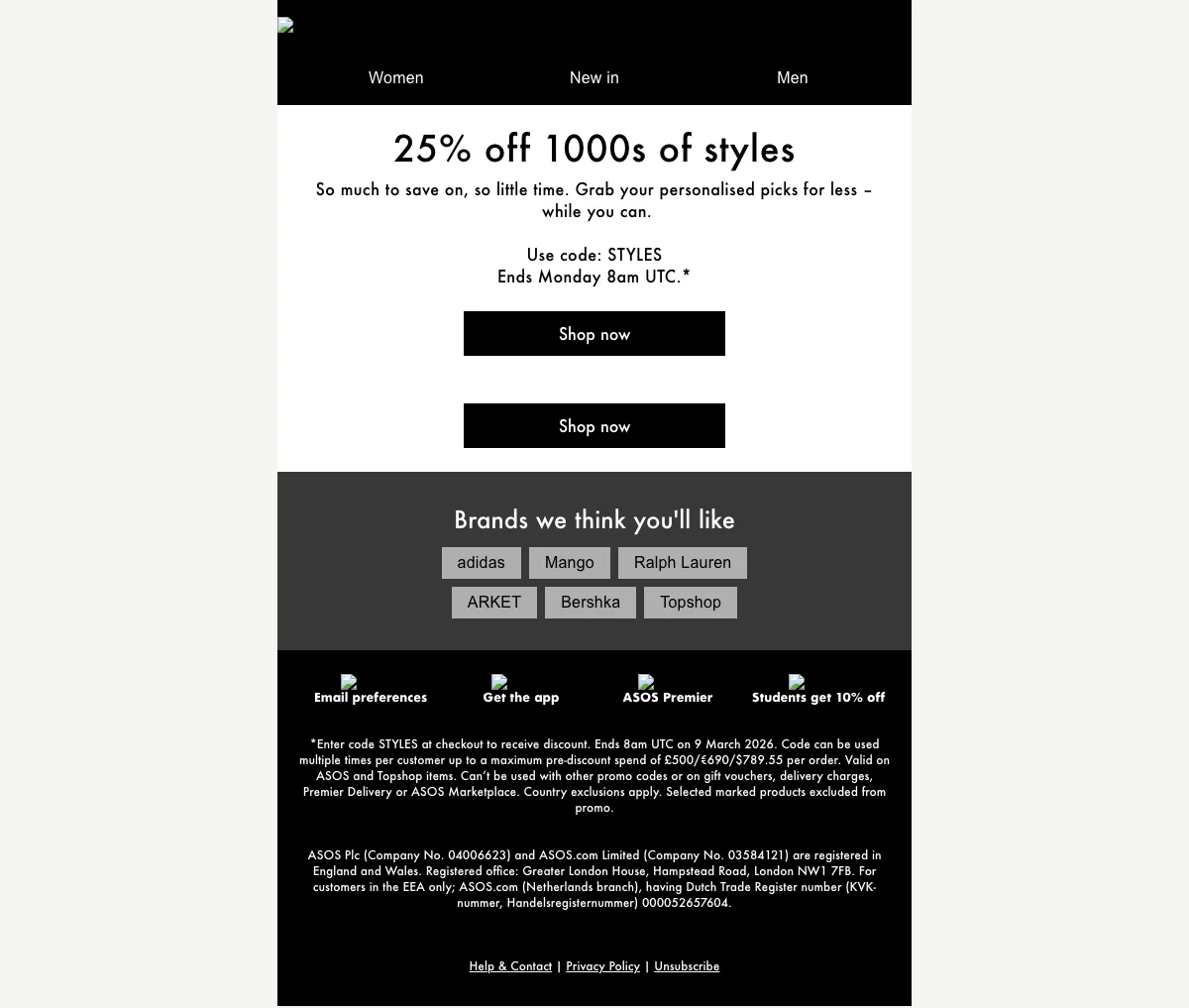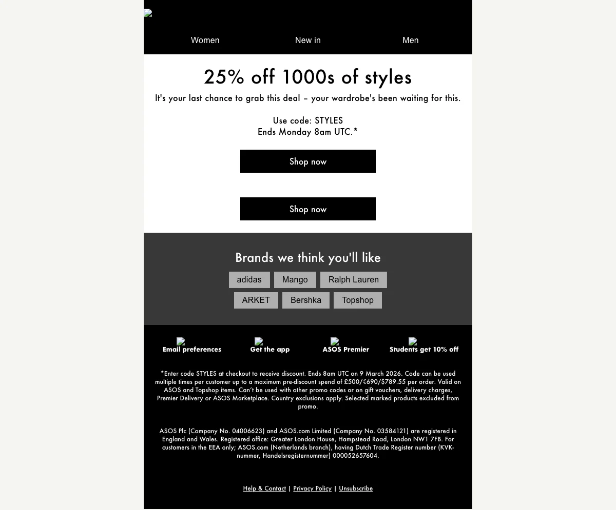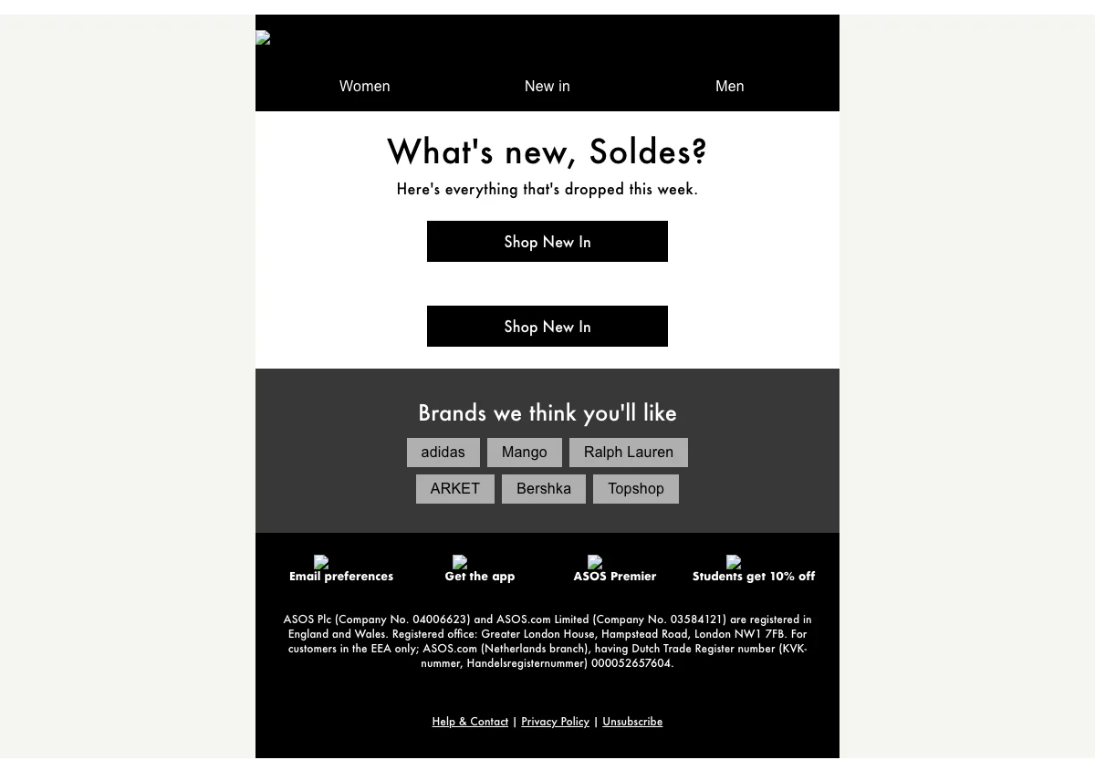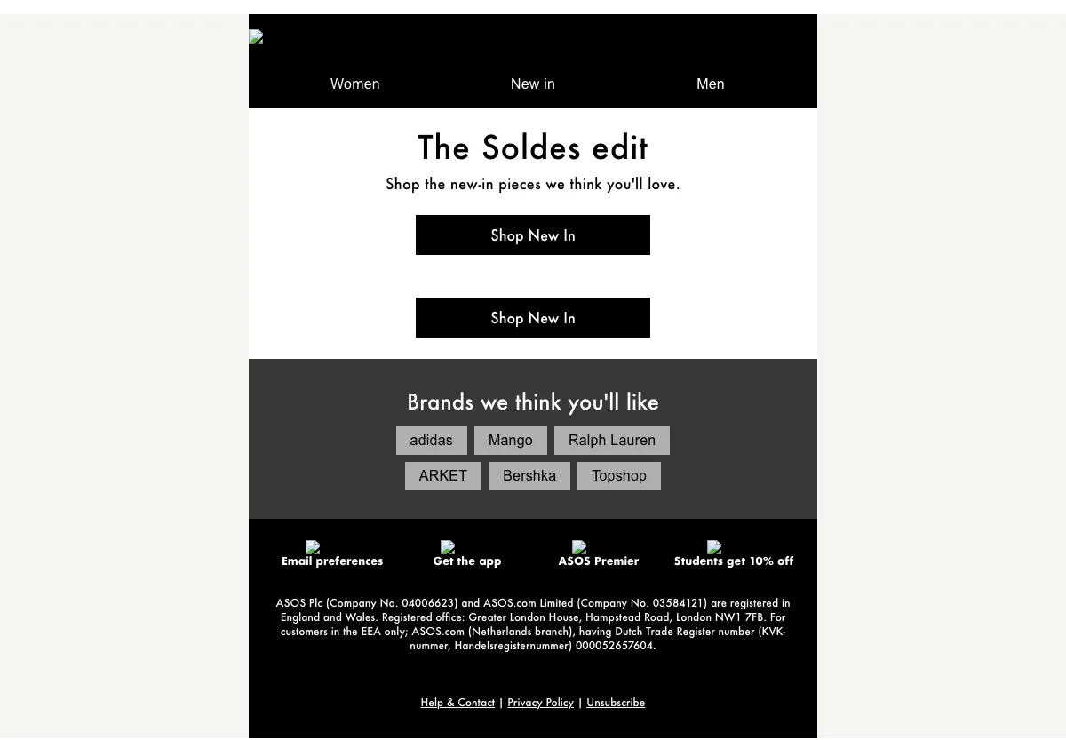 Crée en 2000, la boutique en ligne de mode et beauté propose aujourd'hui plus de 50 000 produits à ses 13,6 millions de visiteurs par mois. Elle offre un large panel de produits, allant du prêt-à-porter féminin comme masculin, en passant par les chaussures, les accessoires ainsi que les cosmétiques. Faire son shopping sur ASOS, c'est la garantie de trouver le produit qu'il vous faut au meilleur prix !