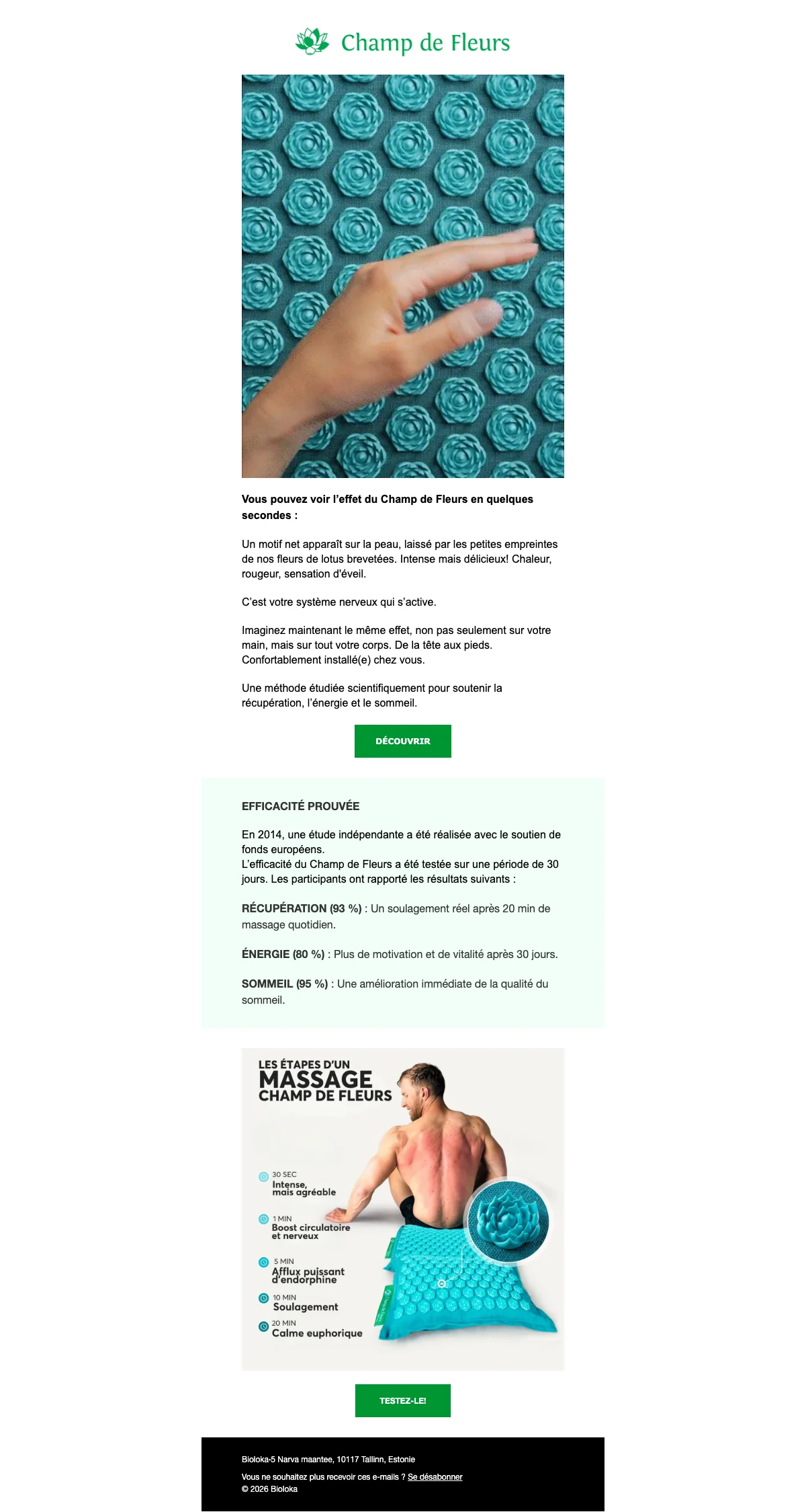 Pour tous vos problèmes de dos, adoptez le Champ de Fleurs ! Ce matelas de 73*45cm est équipé de 221 stimulateurs, chacun composé de 25 pétales au bout pointu. De cette façon, le Champ de Fleur exerce, lorsque vous vous allongez dessus, une pression intense sur plus de 5000 points de votre dos en simultané, déclenchant la sécrétion d'endorphines et soulageant ainsi vos douleurs. Tout votre système nerveux est détendu, et votre circulation sanguine améliorée.
