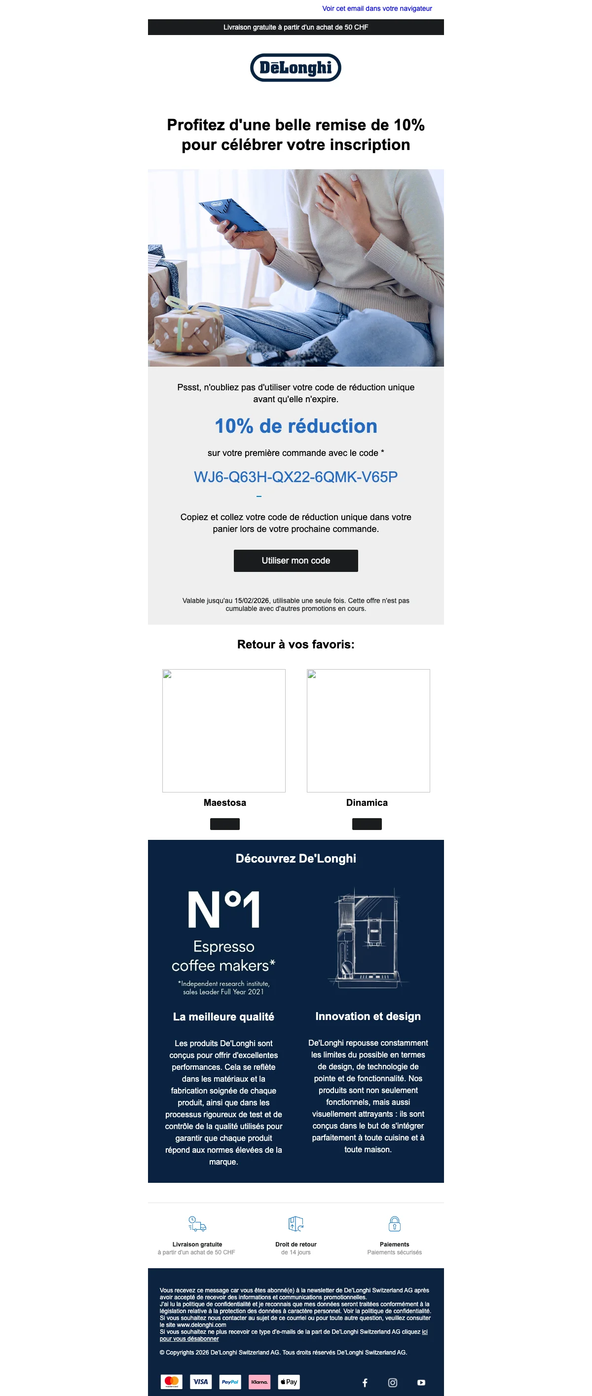 De'Longhi code promo 10% de réduction sur la première commande