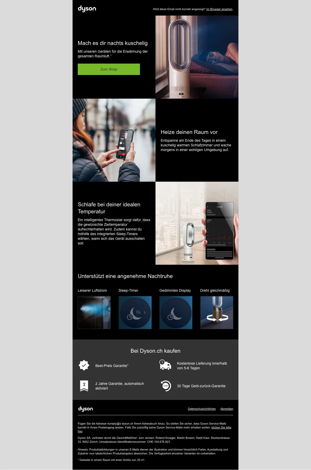Depuis de nombreuses années, la marque tente de limiter ses émissions de gaz à effet de serre, en poursuivant différents objectifs et en mettant en place certaines alternatives qui lui permettent de limiter son impact sur la planète. Parmi ces idées, le campus où sont développées les nouvelles technologies Dyson est accessible en bus pour toutes les personnes devant s'y rendre depuis la campagne anglaise. Les cuisines de ce site sont également équipées de feux à induction, ce qui permet de limiter les besoins de climatisation, étant plus importants dans le cas de l'utilisation du gaz.