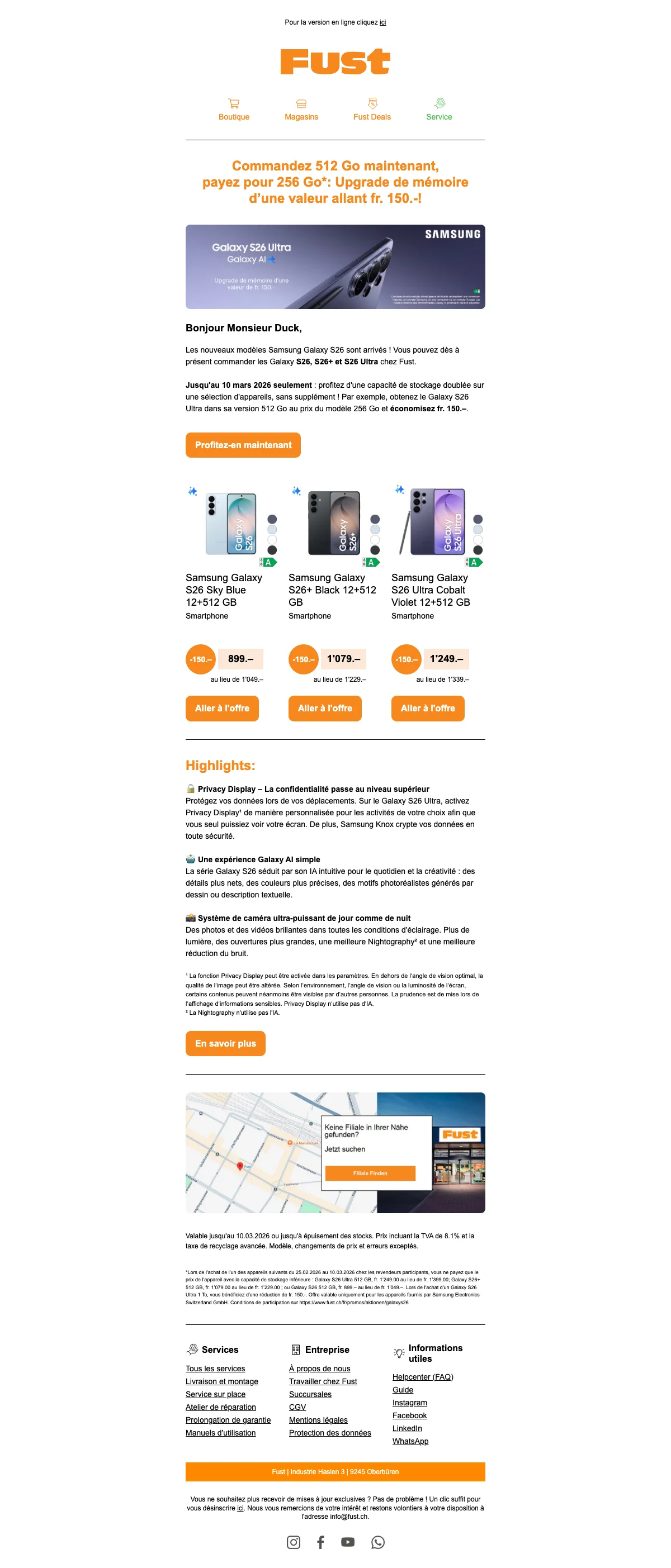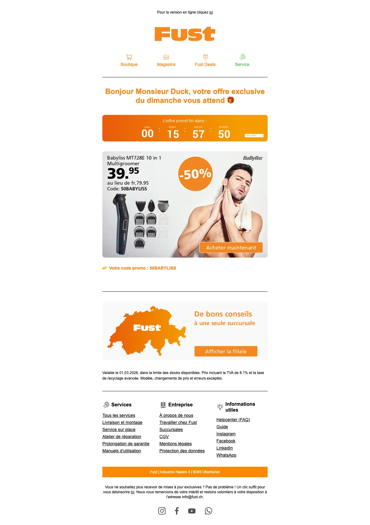 Faire ses achats sur Fust c'est également bénéficier de nombreux services comme par exemple l'aide à la décision afin de savoir s'il est plus judicieux de faire réparer un appareil ou bien d'opter pour un nouvel achat. Vous pourrez aussi bénéficier d'un service d'installation où un employé qualifié vous aidera à prendre en main les travaux d'installation. N'oublions pas le droit d'échange de 30 jours ainsi que la reprise et d'autres services sont également à votre disposition, alors venez en prendre connaissance dès maintenant !