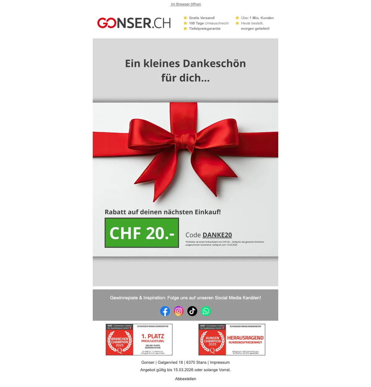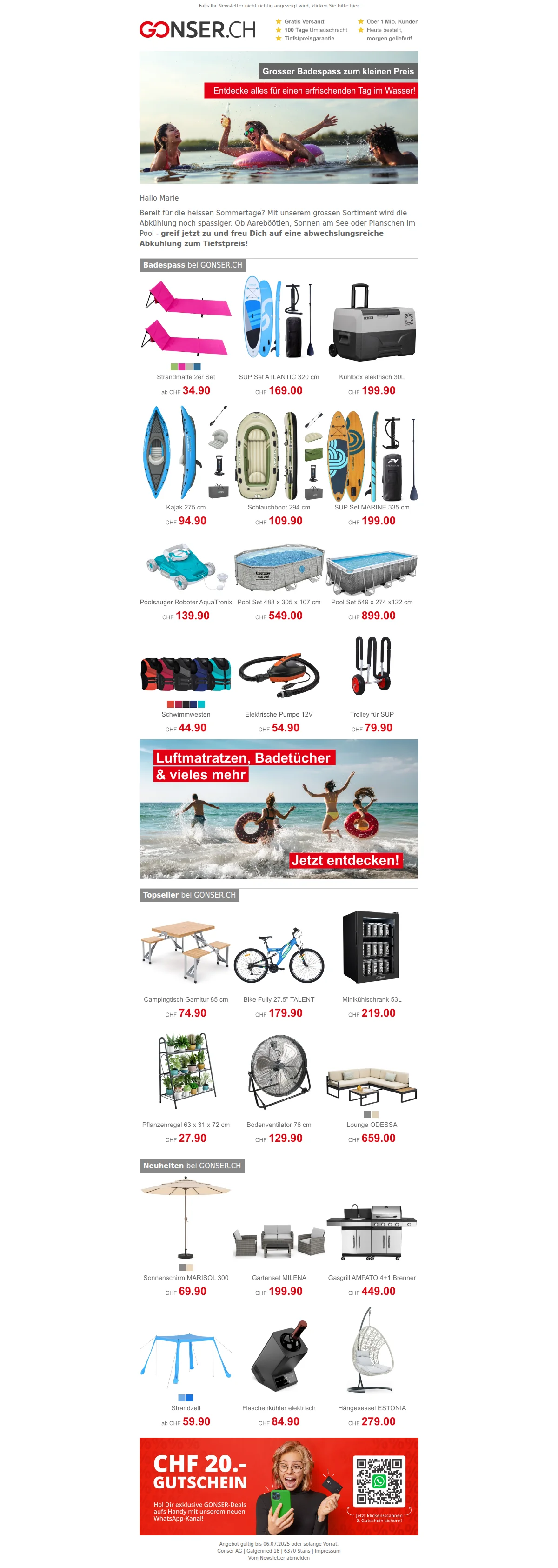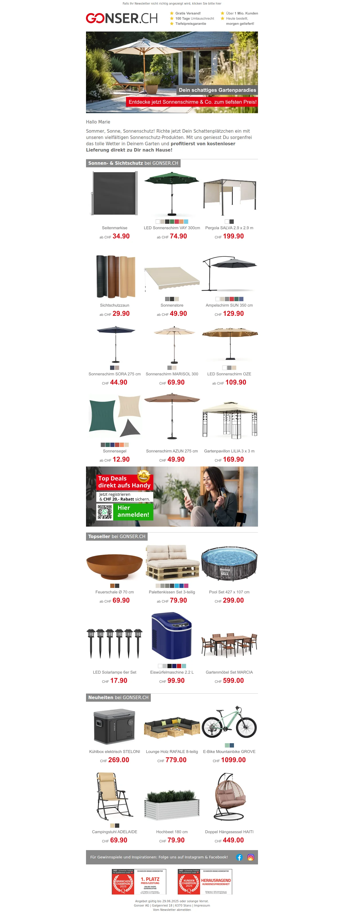 Le site de vente en ligne d'articles de jardin, maison, animaux et bien-être, Gonser.ch est aussi sur Soldesduck ! La boutique en ligne est assez récente, elle a été lancée en 2009. En quelques années, cette boutique a séduit le coeur des milliers de clients à travers la Suisse. La large variété des produits proposés (plus de 200 000 références) permet de combler toute la famille. En effet, vous trouverez des vélos, des salons de jardin, des piscines, des poussettes, du matériel pour bricoler ainsi que des accessoires pour animaux et bien plus encore pour votre vie de tous les jours.