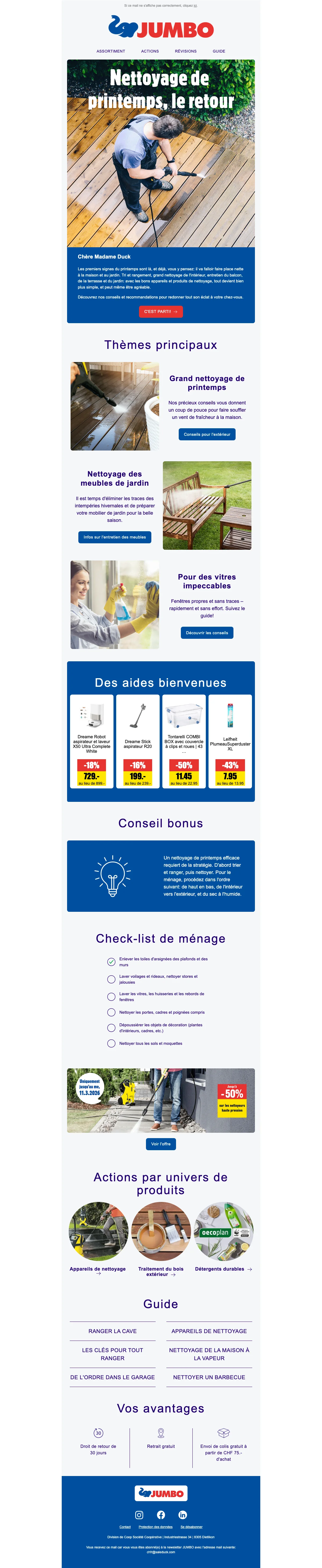 Profitez en avant-première des offres, des nouveaux produits et des astuces professionnelles en vous inscrivant à leur newsletter. Vous recevrez un code de réduction Jumbo de bienvenue offrant CHF 10.- de réduction à partir de CHF 50.- d'achat !