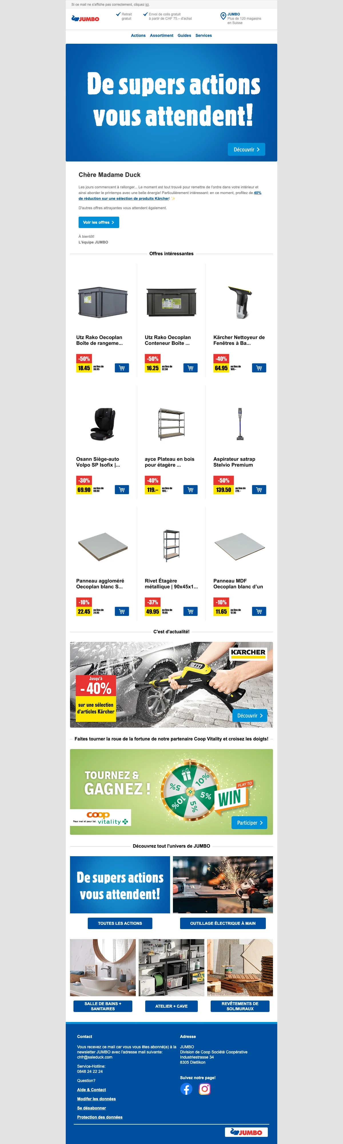 Toute l'année, profitez de remises exceptionnelles sur la boutique en ligne Jumbo.ch allant jusqu'à 60%. N'attendez plus pour économiser de l'argent sur vos travaux, votre vélo et pourquoi pas votre future piscine ! Ce ne sont pas les surprises qui manquent sur Jumbo.ch.
