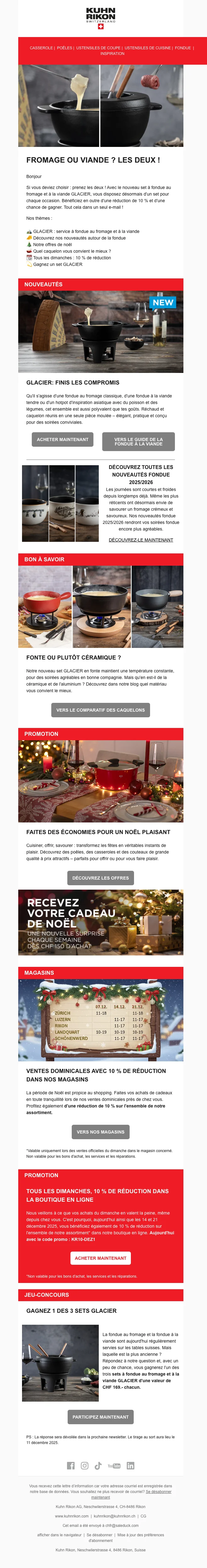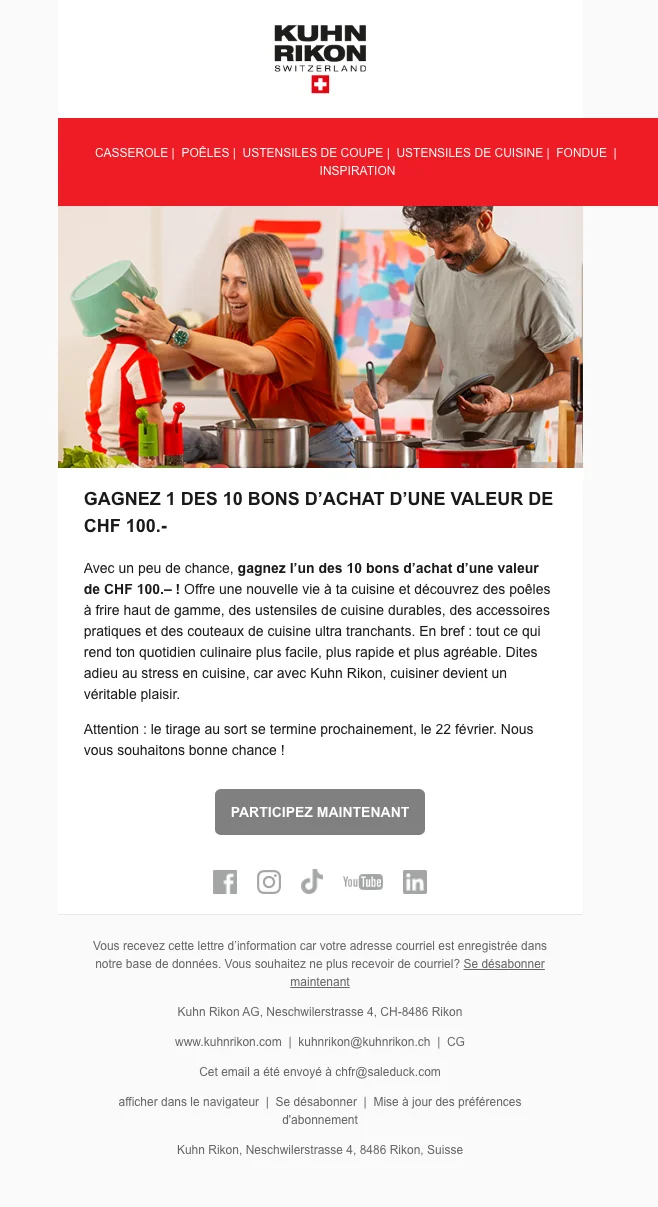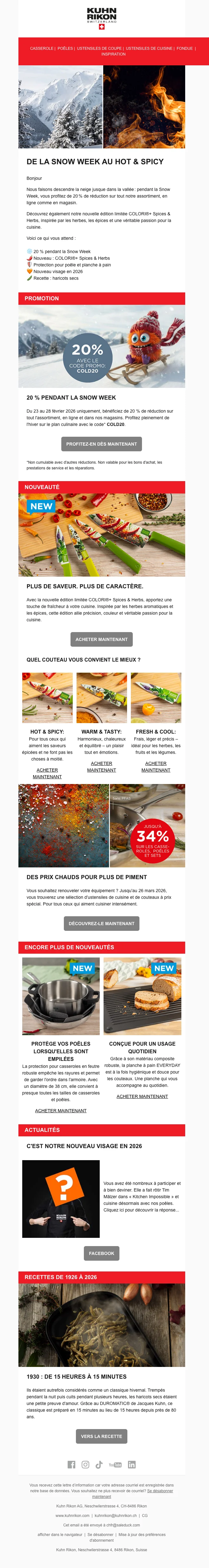 Nous surveillons en continu les offres de Kuhn Rikon via le site officiel, les réseaux partenaires et les newsletters des boutiques en ligne. Les nouvelles promotions sont contrôlées automatiquement et manuellement afin d’en vérifier la validité.