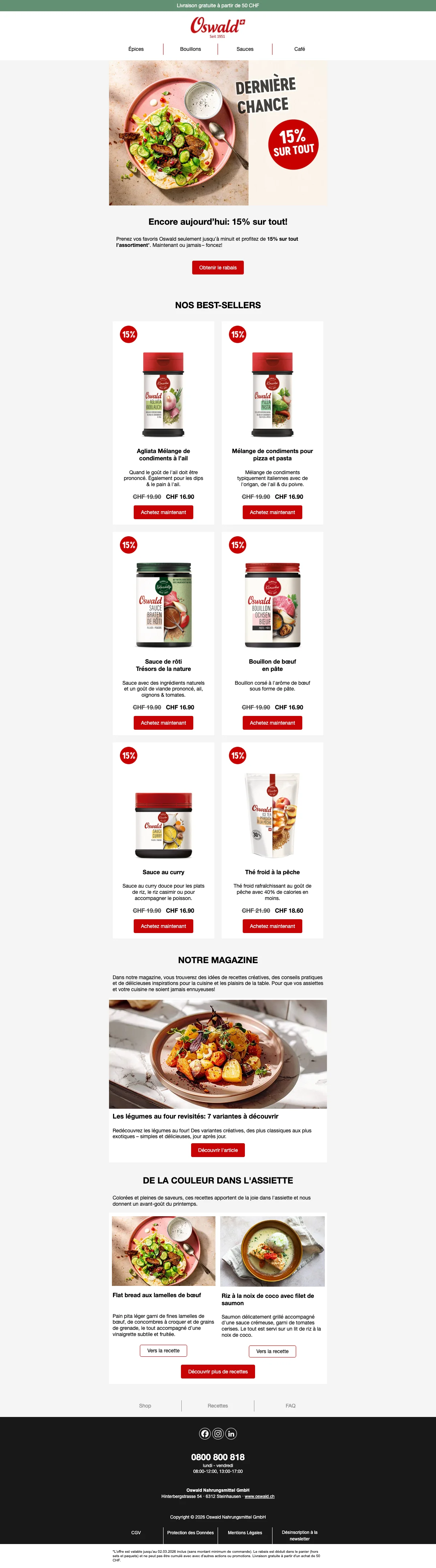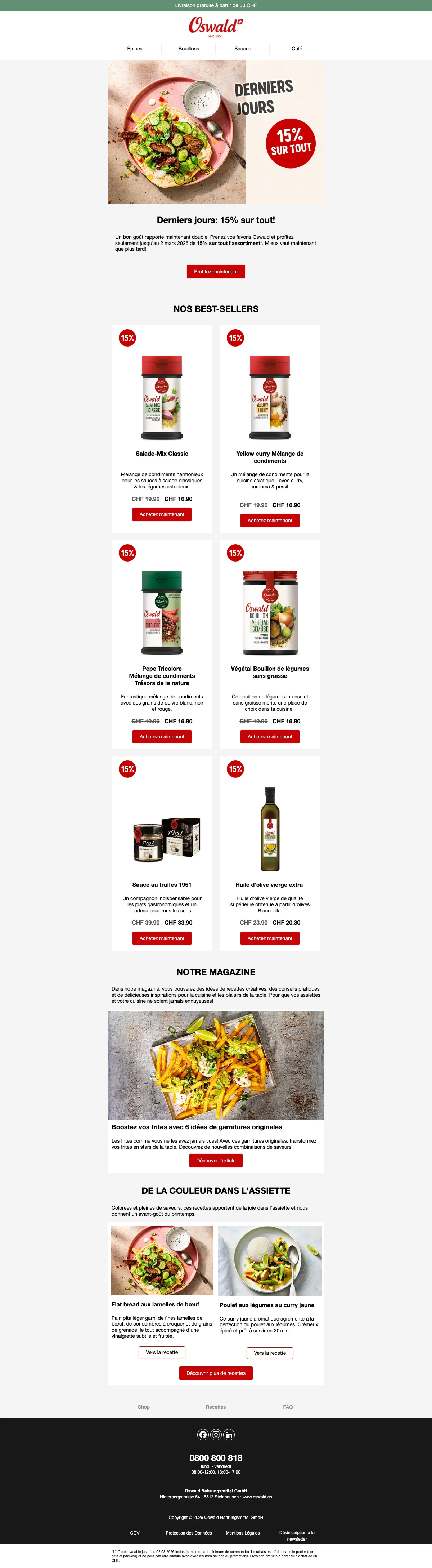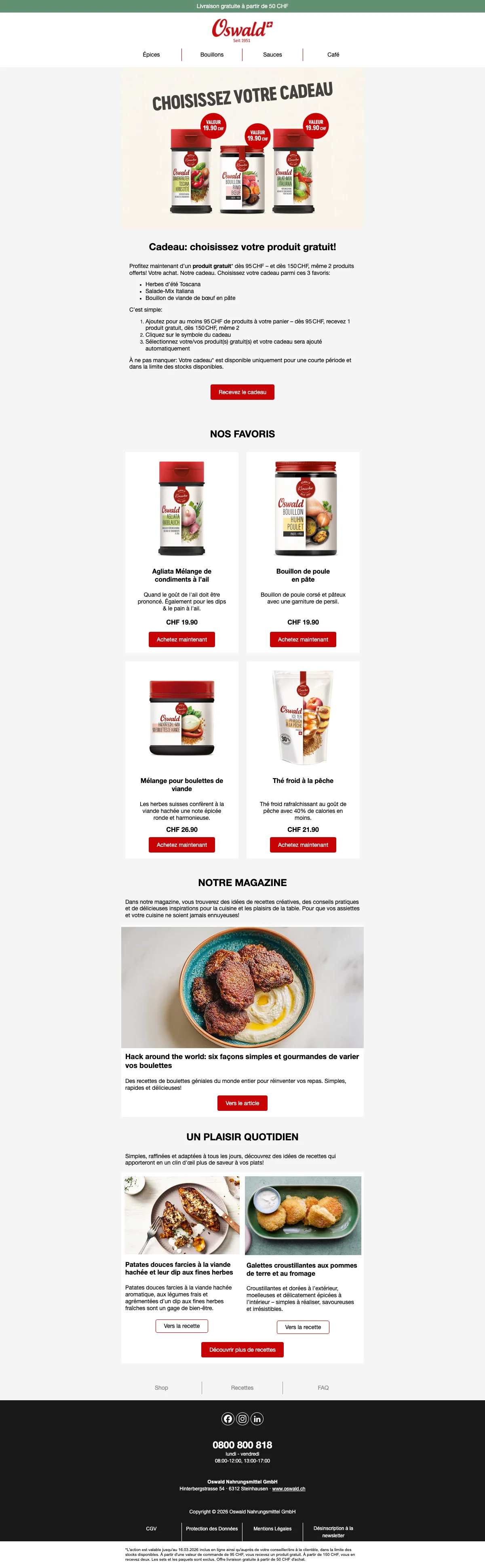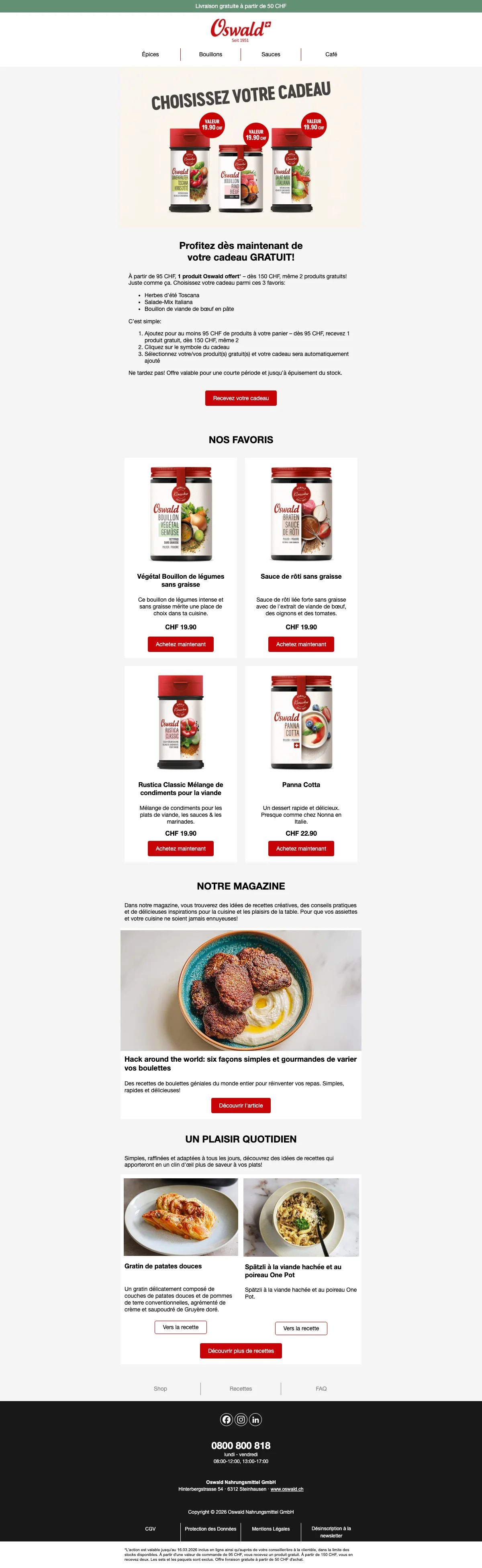 Plus de 200 conseillers sont disponibles pour vous en Suisse, et vous aident à trouver les idées recettes ou des astuces pour toutes les occasions. C'est une bonne excuse pour inviter des amis chez vous et leur faire découvrir vos nouvelles trouvailles gastronomiques. Vous pouvez également trouver vos recettes préférées à l'aide de la catégorie recettes de la boutique en ligne. Apprenez à faire des galettes de risotto au coeur de mozzarella ou un boeuf Stroganoff bien relevé en suivant à la lettre les recettes créées par les experts Oswald. Chaque mois, de nouvelles recettes sont ajoutées et vous font découvrir l'utilisation des épices et condiments Oswald. La cuisine n'aura alors plus aucun secret pour vous !