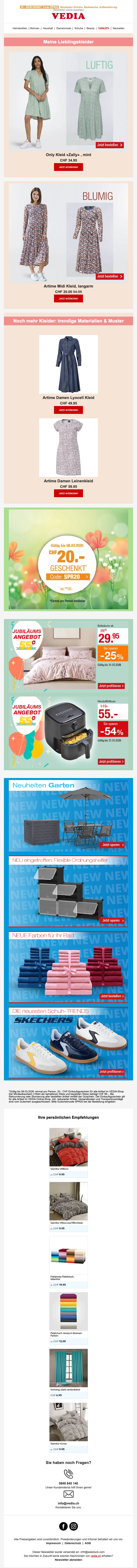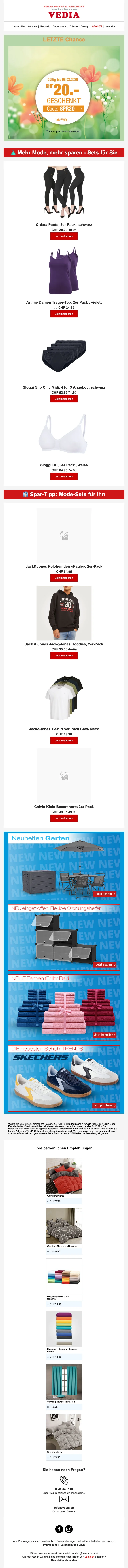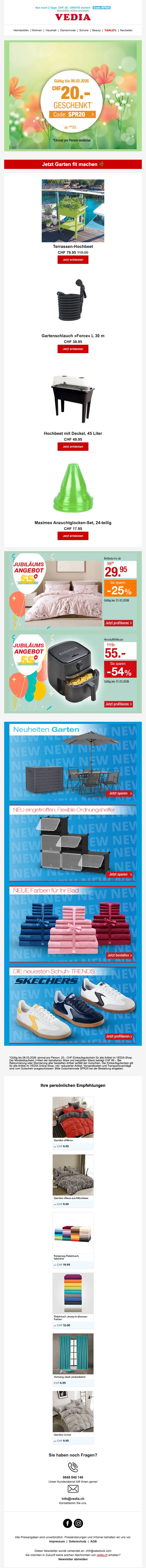 Gardez un oeil sur nos offres pour bénéficier de remises exceptionnelles sur votre panier ou sur vos frais de port. Soldesduck a régulièrement un code promo pour vous profiter de la livraison gratuite, étant donné que les frais d'expédition standards s'élèvent à CHF 6.95.- ! Profitez des rabais et des soldes sur le magasin en ligne Vedia toute l'année en consultant leur assortiment Déstockage. N'oubliez pas de vérifier sur cette page les offres spéciales et codes promo en cours de validité pour économiser encore plus.