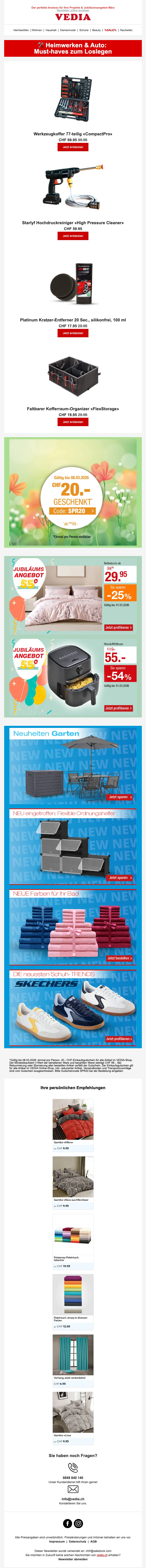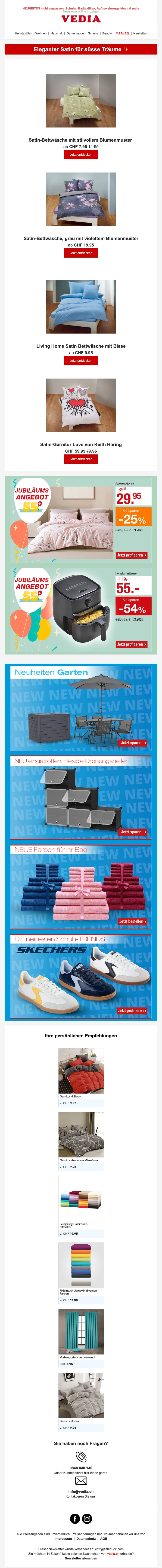 Fondée en 1971 à Genève, Vedia est une entreprise de vente à distance Suisse. Elle propose une grande diversité de produits à prix très raisonnables toute l'année. C'est la boutique en ligne pour le sport, la mode, la cuisine et l'ameublement ! Sur la boutique web, vous pouvez trouver des articles de mode pas chers, des produits pour l'extérieur ou même des voyages ! Retrouvez des marques comme Babyliss, Triumph, Philips, Electrolux, Moulinex, Koenig, Tefal à prix mini.