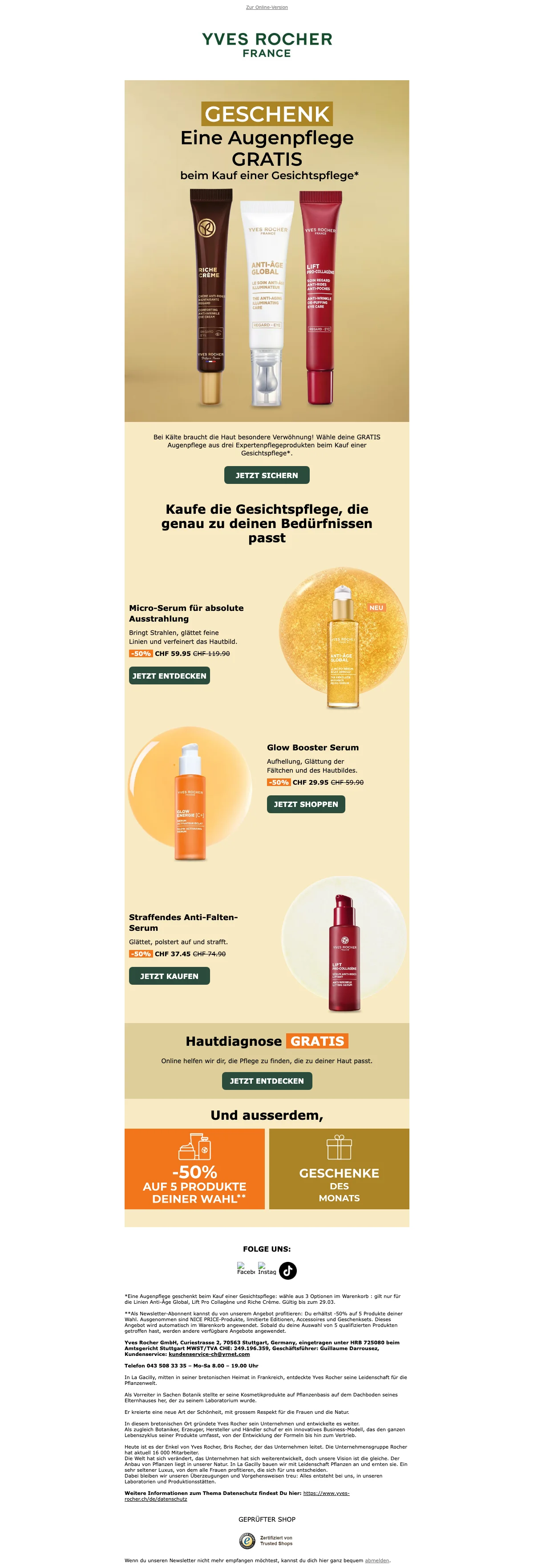 La marque organise régulièrement des promotions sur le site suisse et Soldesduck sera le premier à vous en informer. Vous recevrez très souvent un cadeau avec votre commande et profiterez de réduction même en dehors des soldes. Vous pourrez recevoir régulièrement 50% de réduction sur certains produits de beauté, notamment si vous possédez la carte de fidélité.