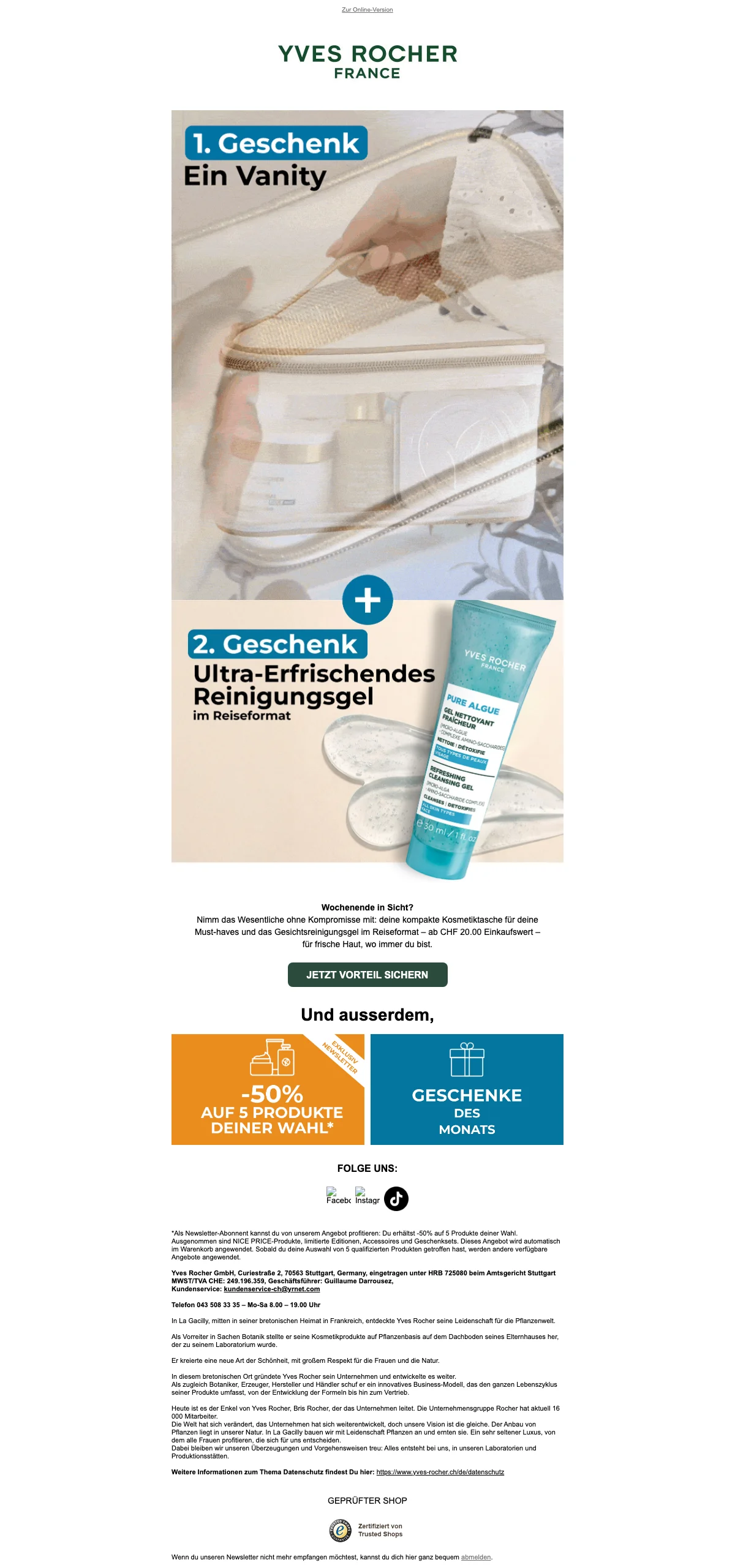 Il existe une multitude de magasins en propre, une boutique en ligne et il est aussi possible de profiter de l'expérience soin en instituts. Tous les meilleurs bons plan et code offre Yves Rocher Suisse sont regroupés sur cette page, alors n'attendez plus pour en profiter !